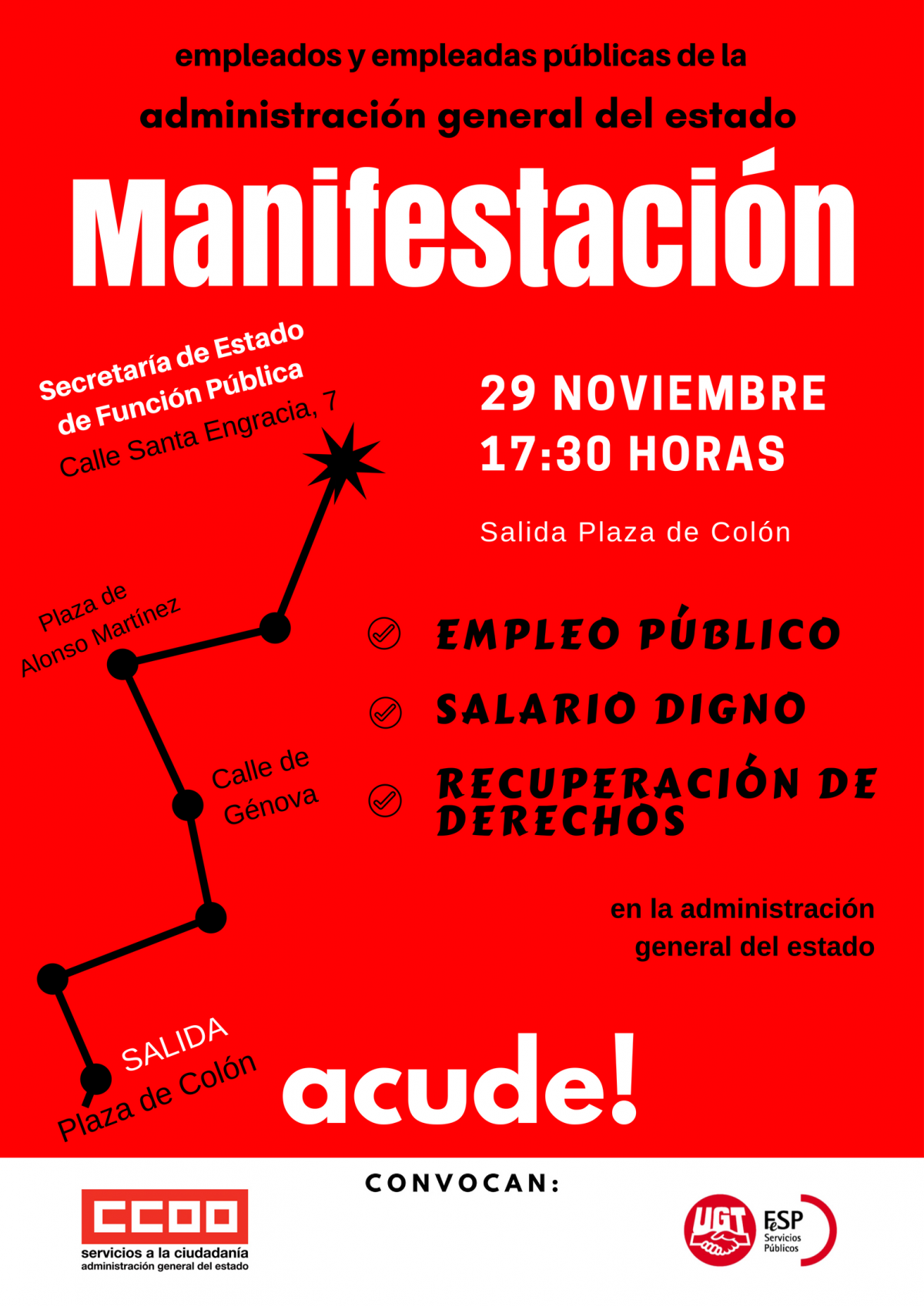 CCOO y UGT convocan al personal de la Administración General del Estado (AGE) el próximo 29 de noviembre en Madrid. "Por el empleo público, salario digno y recuperación de derechos" es el lema que preside la manifestación que partirá a las 17:30 h. desde la Plaza de Colón y discurrirá hasta la Secretaría de Estado de Función Pública (Calle de Santa Engracia, 7).