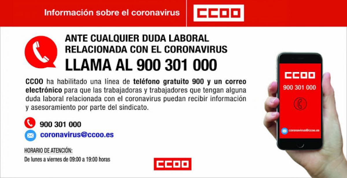 La Confederación Sindical de CCOO ha habilitado un teléfono gratuito 900 y un correo electrónico para que las trabajadoras y trabajadores que tengan alguna duda de carácter laboral relacionada con la situación de emergencia sanitaria causada por el coronavirus reciban información y asesoramiento. El horario de atención telefónica será de lunes a viernes de 9 a 19 horas y sábados y domingos de 10:00 a 14:00 horas.