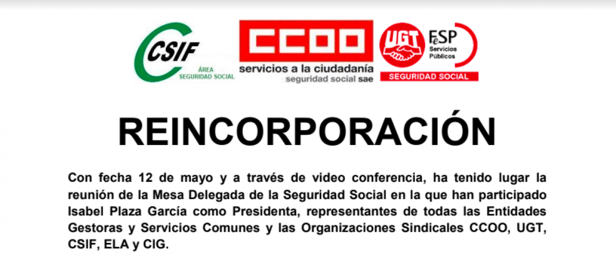 Con fecha 12 de mayo y a través de video-conferencia, ha tenido lugar la reunión de la Mesa Delegada de la Seguridad Social en la que han participado Isabel Plaza García como Presidenta, representantes de todas las Entidades Gestoras y Servicios Comunes y las Organizaciones Sindicales CCOO, UGT, CSIF, ELA y CIG.
